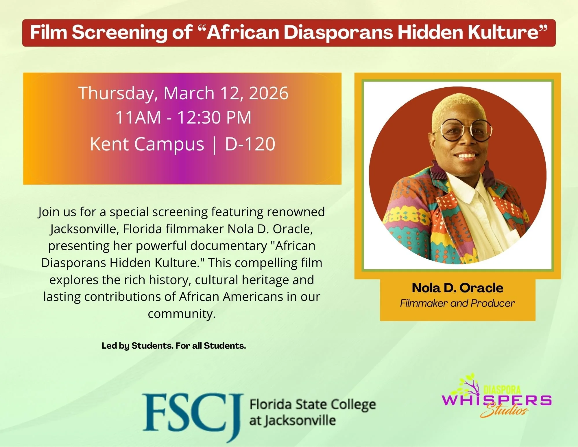 The month kicked off at Florida State College at Jacksonville with a screening of African Diasporans Hidden Kulture Part I: Jacksonville, Florida. The film explores the rich history and heritage of African Americans who have made extraordinary contributions in Jacksonville, Florida, shining a light on stories that often go untold.