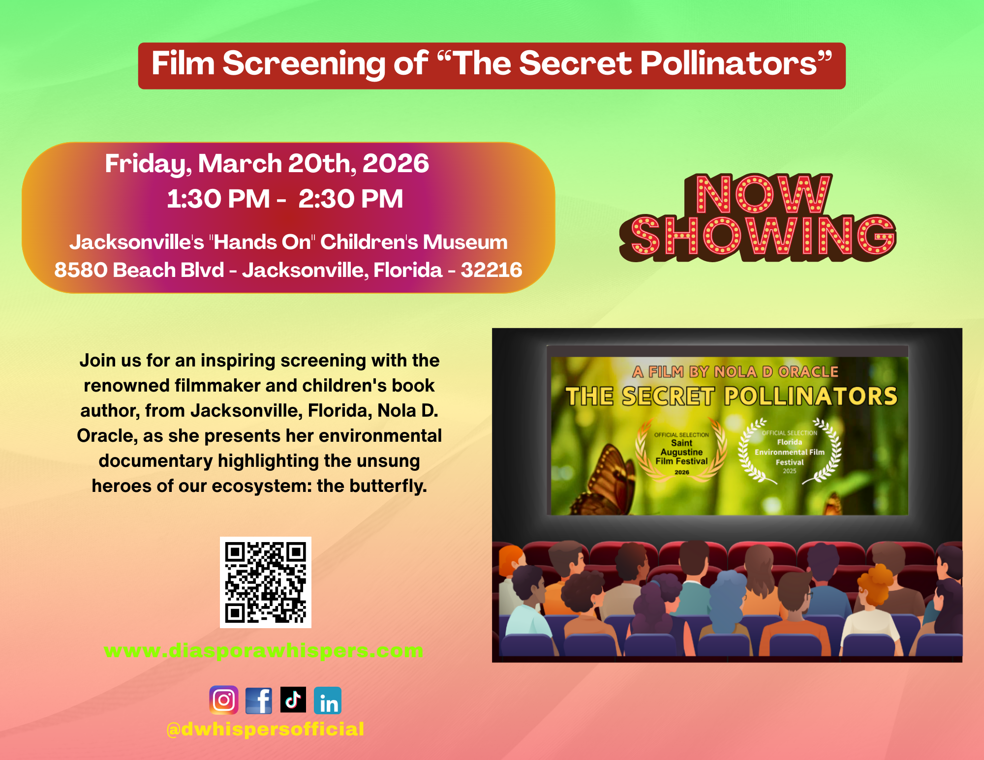 The following week, Diaspora Whispers Studios brought The Secret Pollinators to Jacksonville's Hands On Children's Museum for an audience of families, young learners, and nature lovers. The environmental documentary highlights the unsung heroes of our ecosystem: butterflies.